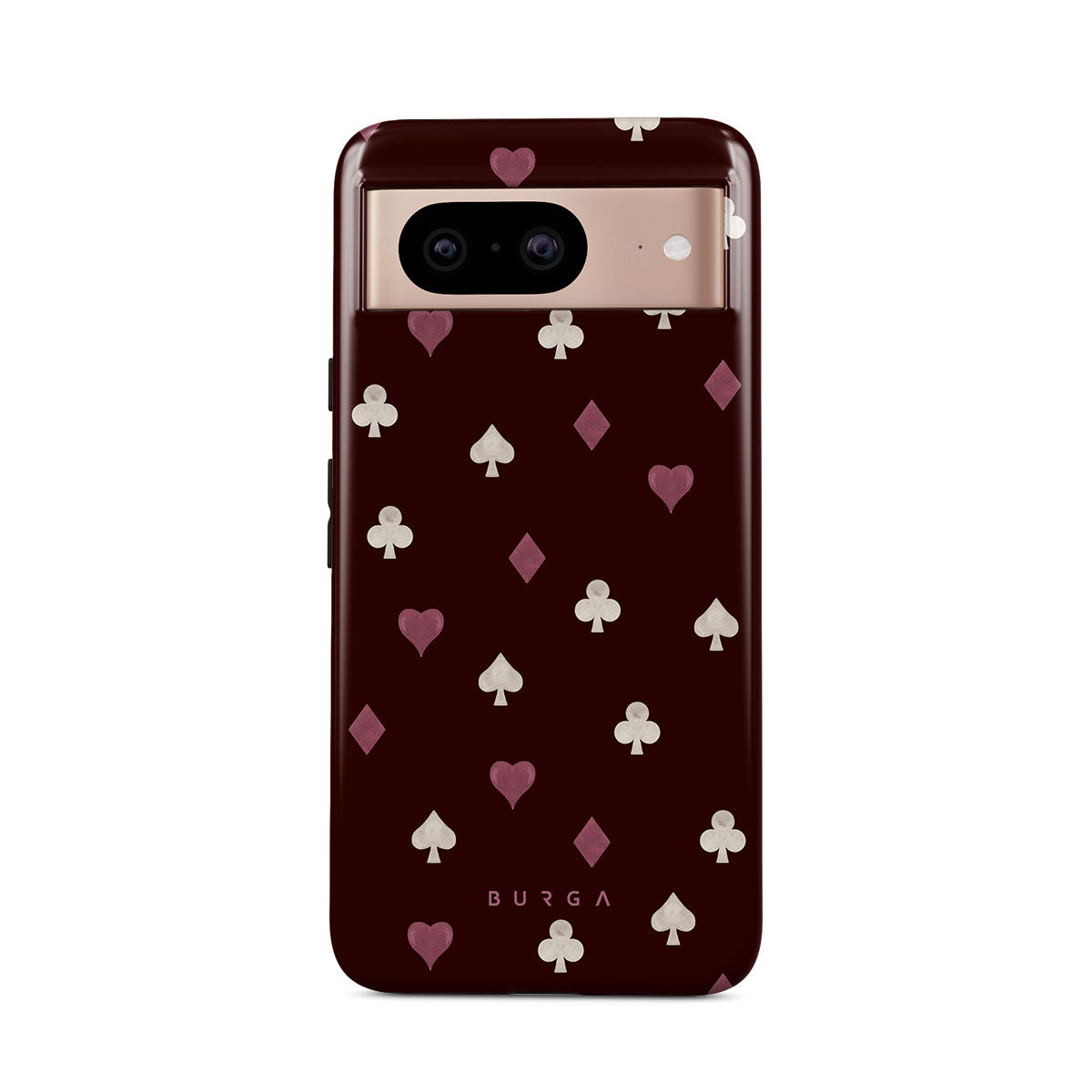 Nothing is as it appears. Hearts, clubs, diamonds, and spades—stacked in your favor or playing against you? This Google Pixel 8 phone case design features a rich burgundy background and minimalist suits that make for a game where the rules are constantly shifting.