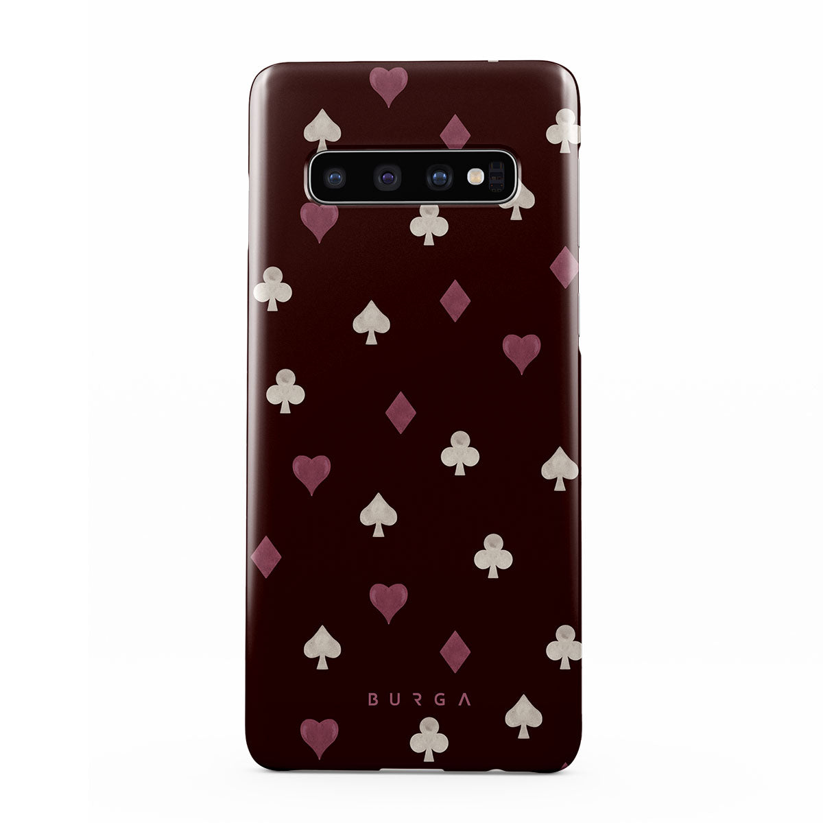 Nothing is as it appears. Hearts, clubs, diamonds, and spades—stacked in your favor or playing against you? This Samsung Galaxy S10 Plus phone case design features a rich burgundy background and minimalist suits that make for a game where the rules are constantly shifting.